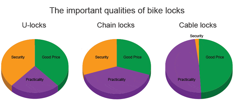 Well, there are three main types of well established bike lock to choose from: U-locks (also known as D-locks), chain locks and cable locks. All locks offer a compromise between three fundamental qualities: price, practicality and security. And the charts below aim to show the balance of these qualities across the three main types of lock.